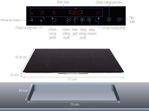 Kích thước vùng nấu:Trái: Ø21 cm – Giữa: Ø16 cm – Phải: Ø29 cm