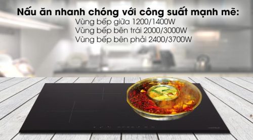 Công suất vùng nấu:Trái: 2000/3000W – Phải: 2400/3700W – Giữa: 1200/1400W