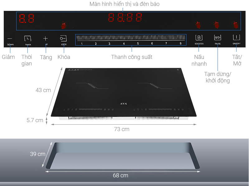 Tính năng an toàn: khóa bảng điều khiển, tự ngắt khi bếp nóng quá tải, tự ngắt khi điện áp quá cao/thấp.
