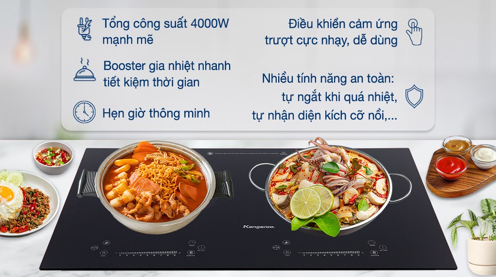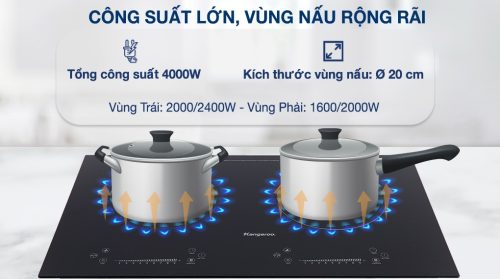 Công suất vùng nấu:Trái: 2000/2400W – Phải: 1600/2000W