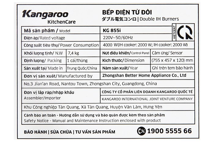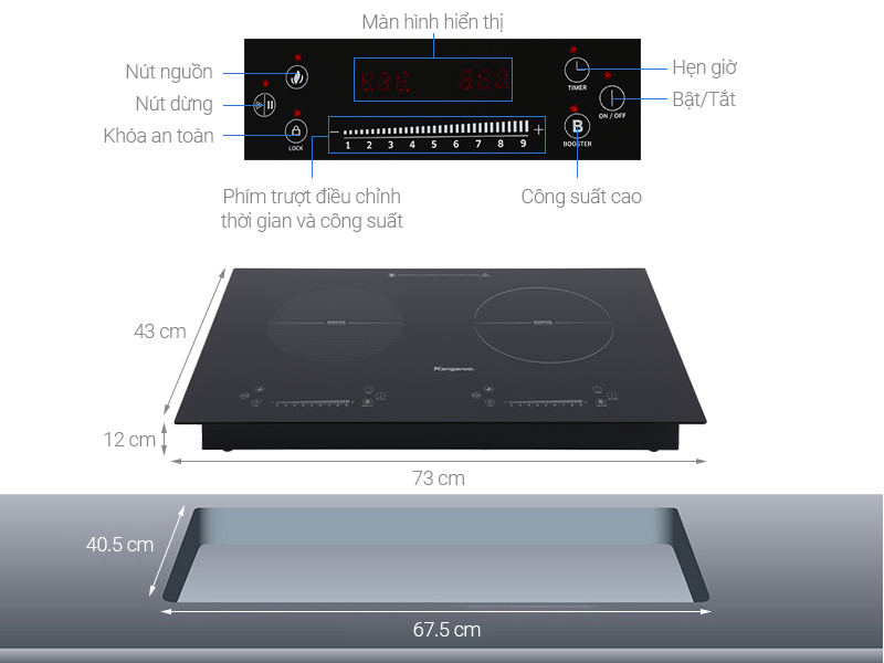Tính năng an toàn:Tự nhận diện kích cỡ đáy nồi; Tự ngắt khi bếp nóng quá tải; Tính năng dừng bếp tạm thời; Tự ngắt khi không có nồi; Cảnh báo khi không có nồi; Khóa bảng điều khiển