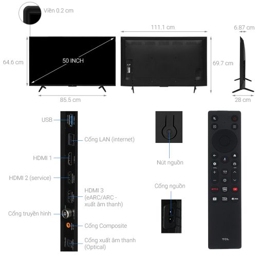 3 cổng HDMI có 1 cổng HDMI eARC (ARC), 1 cổng Composite