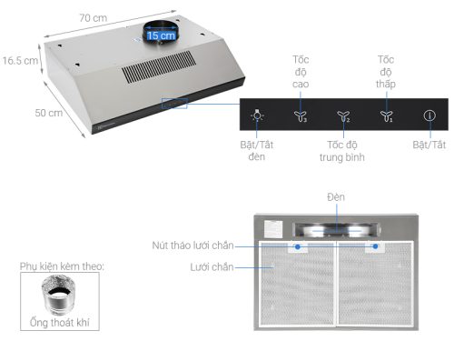 Tiện ích:Có bộ lọc khử mùi than hoạt tính (tích hợp trong máy); Có đèn LED chiếu sáng tiện lợi