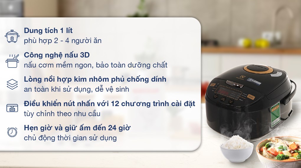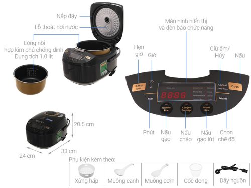 Tiện ích: Hẹn giờ nấu xong; Có xửng hấp; Giữ ấm 24 giờ; Điều chỉnh thời gian nấu